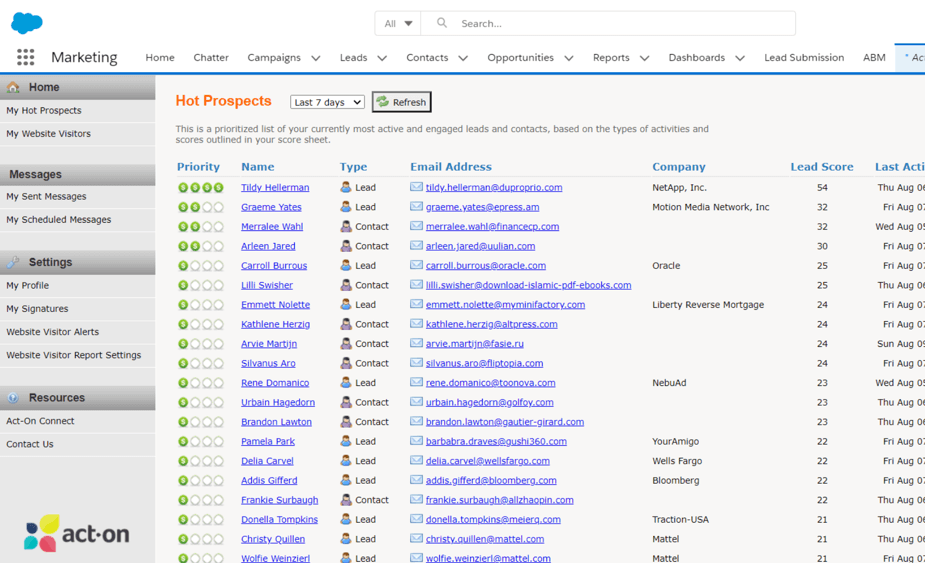 Marketing automation & Salesforce integration allows Sales and Marketing to compile important lead information (such as contact name, industry, and location) that your salespeople need to know before they talk to a potential customer. Better yet, when you integrate Salesforce with Act-On marketing automation, your sales team can also gain visibility into a lead’s engagement and activity history to help them have more targeted conversations and refine their sales approaches.
