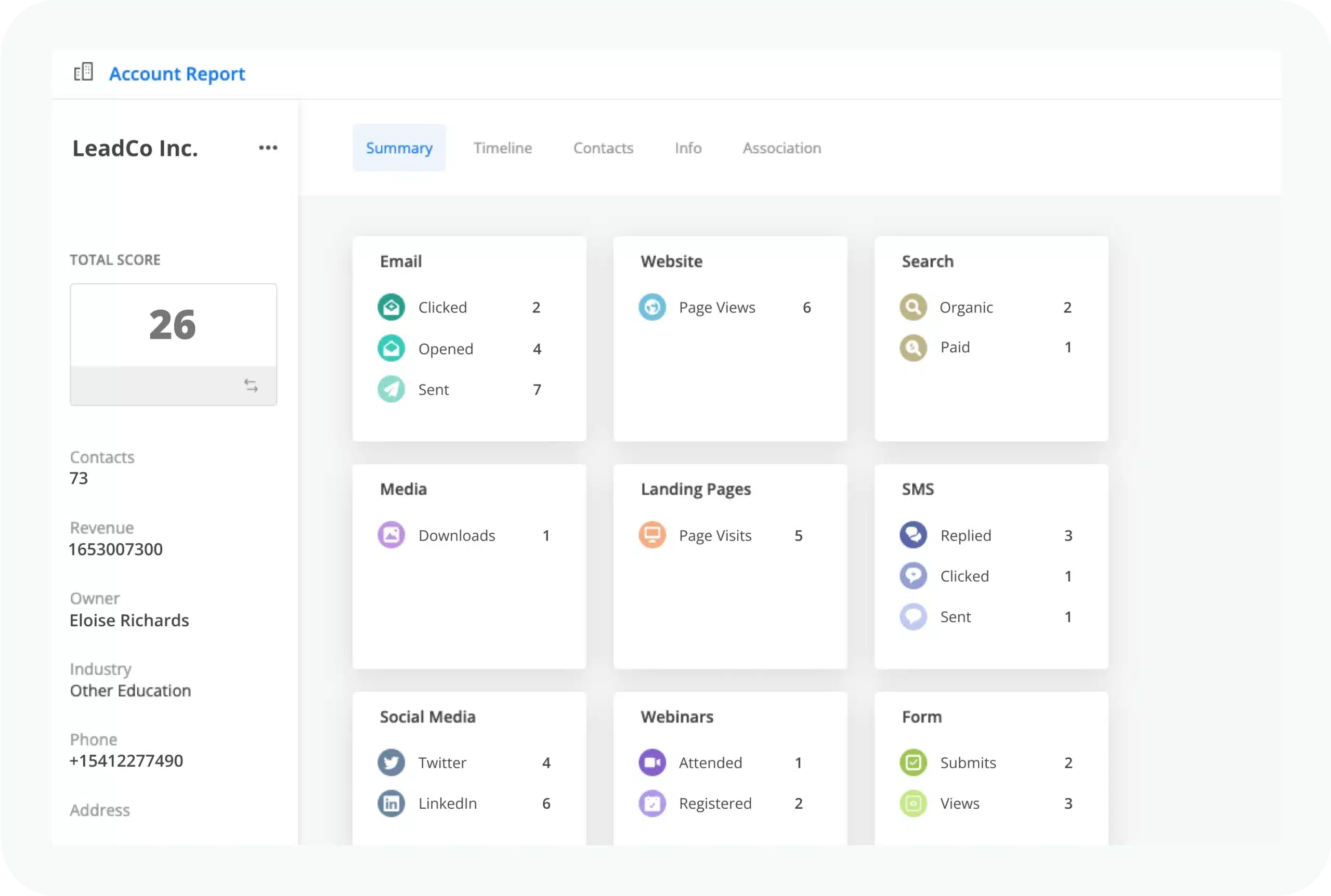 Increase your sales pipeline by handing Sales’ qualified leads, scored based on Ideal Customer Profile demographics and firmographics, plus prospect engagement behavior that conveys buying interest. Act-On Sales Intelligence provides all this information, plus complete activity timeline, to sales through Act-On or integrated into your CRM.