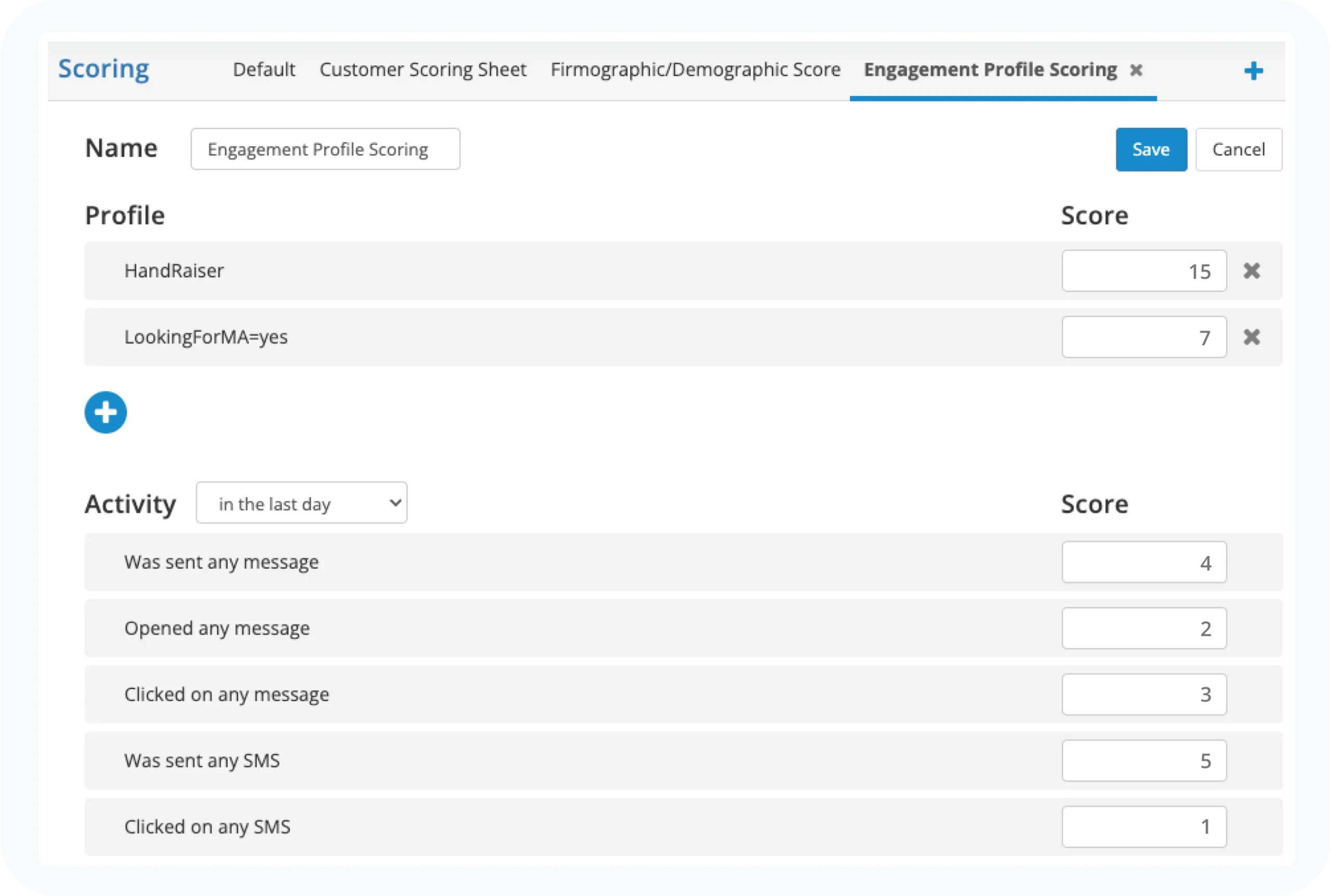 Develop lead scoring models to understand prospects’ intentions based on demographics, firmographics, and behavior. Track and score prospects based on engagement activity such as website visits, content views, form-fills, email opens, webinar attendance, social media reply, content syndication download and many more. Develop multiple models to represent new leads vs. customer engagement.