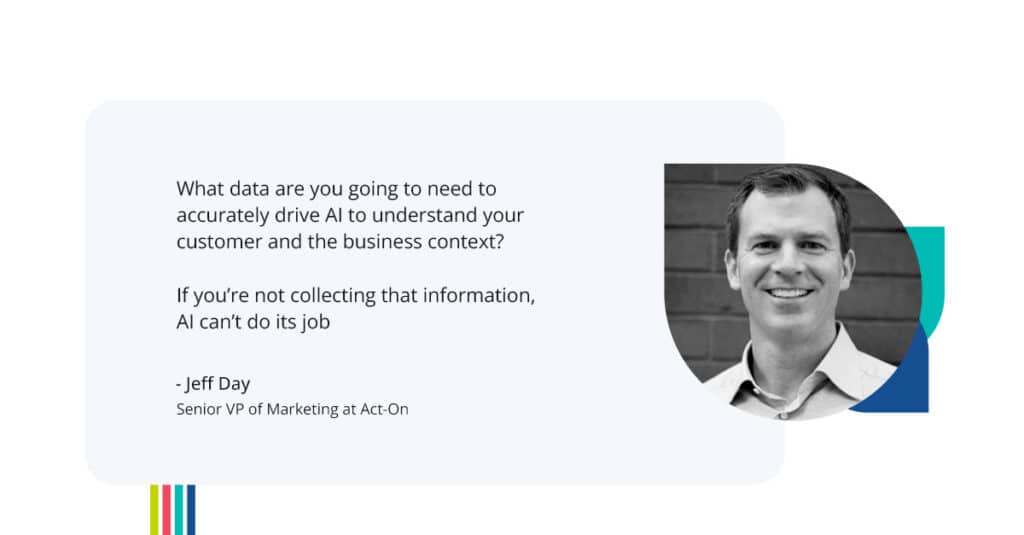 As the possibilities of AI-powered personalization increase, Jeff advises marketing leaders to start planning their strategy now — including how to gather and share critical data. “What data are you going to need to accurately drive AI to understand your customer and the business context? If you’re not collecting that information, AI can’t do its job.”