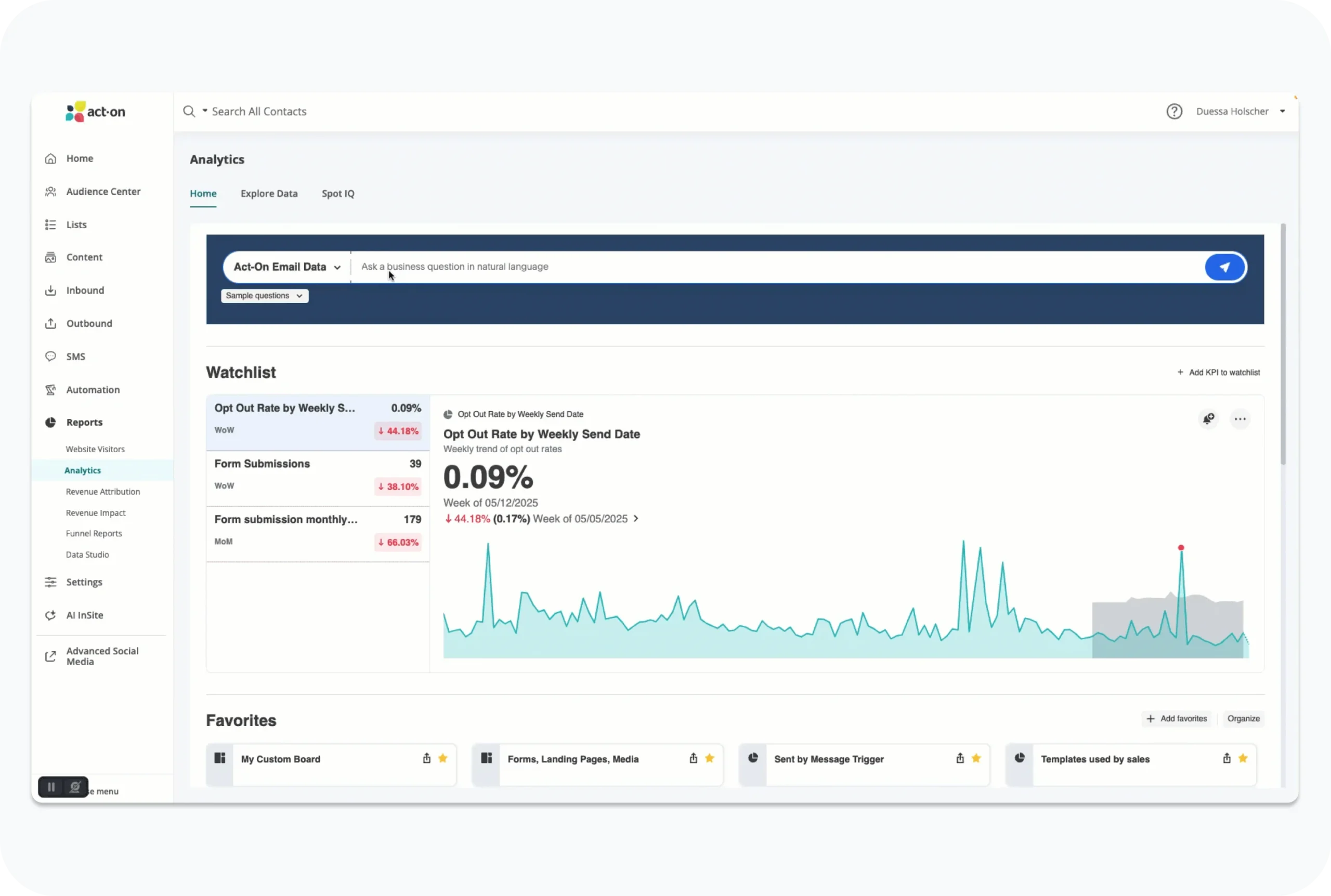 Find previously undiscovered value with Act-On’s AI Insights. SpotIQ helps you dive deep into your marketing performance to discover trends, correlations, and outliers. Run AI analysis on demand or on schedule so you’ll always have the details behind the data.