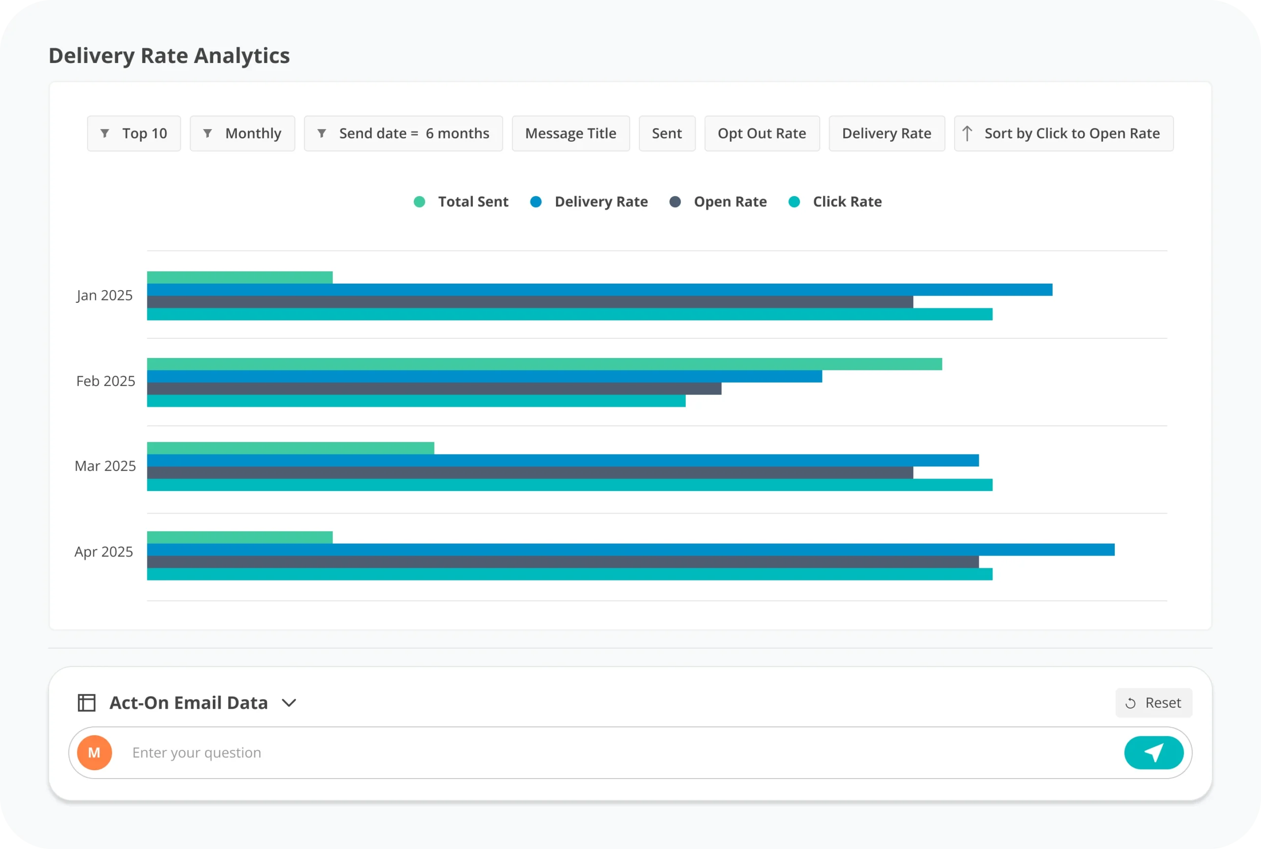 This analytics suite is another great tool from Act-On that allows my marketing team to quantify results of our campaigns and take action to maximize success. The customizable reporting and dashboards give us clear, easy-to-share information and allow us to collect valuable insights and trends from our campaigns. The new tool really gives us the power to confidently move forward with strong business intelligence.