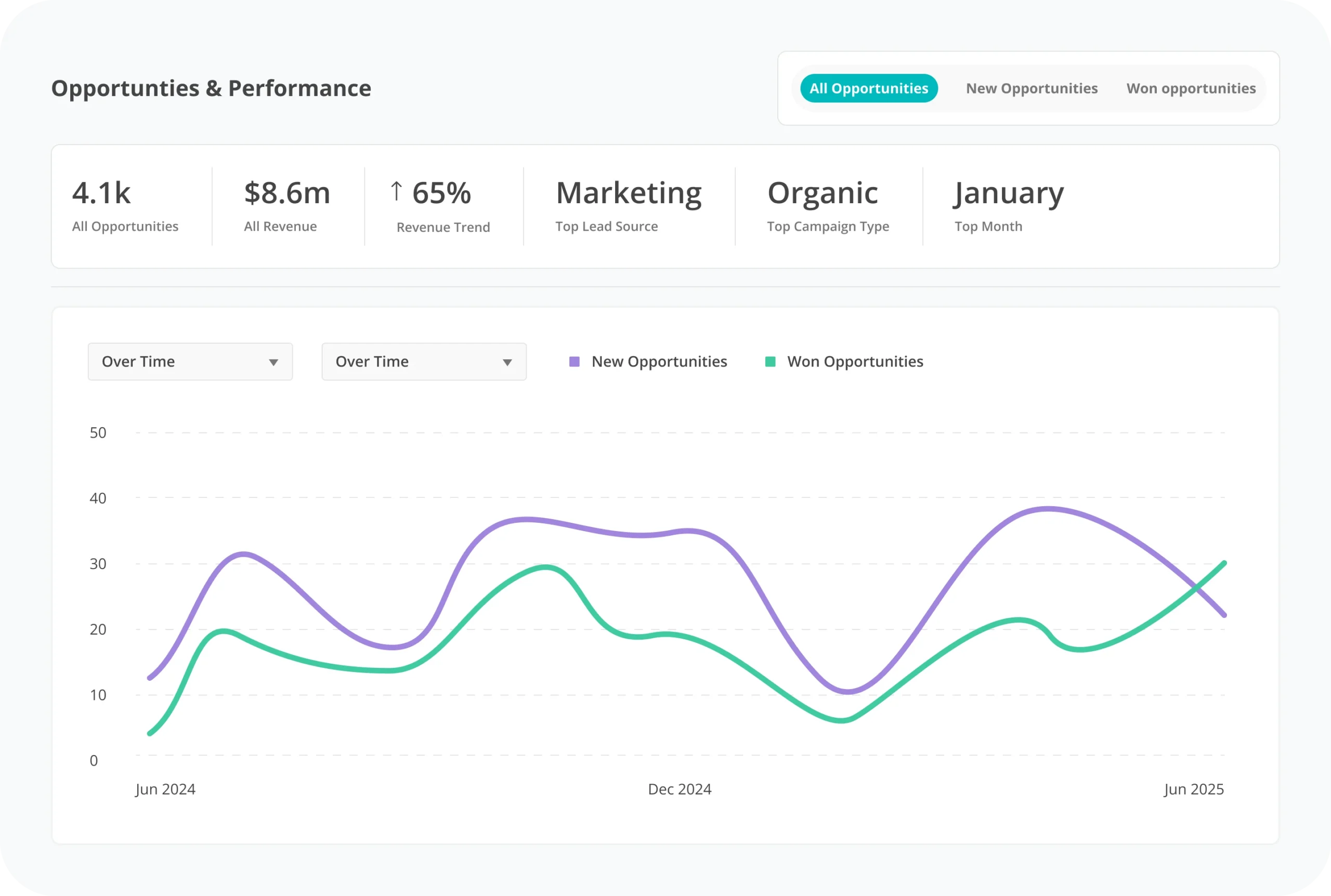 Everything in the Standard Reporting package plus integrated CRM Revenue, Funnel, and Attribution reports with enhanced customizable, shareable, scheduled reporting and dashboards.